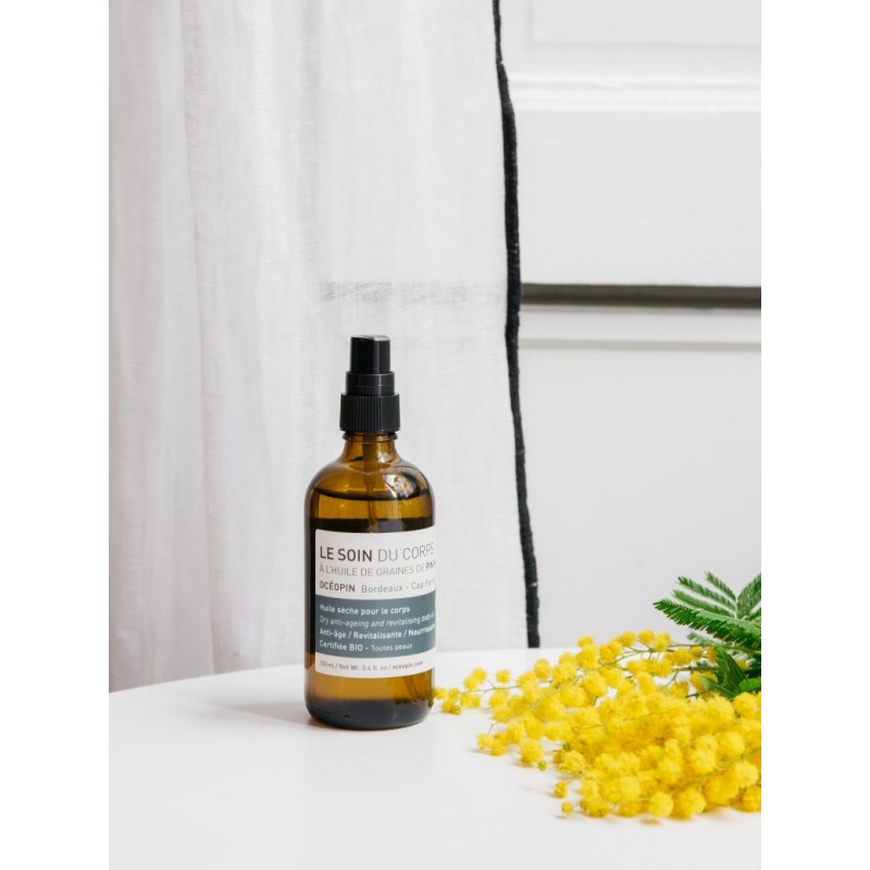 Une huile sèche anti-âge, revitalisante et nourrissante, non grasse, qui régénère et sublime l’épiderme. Composée d’un quatuor d’huiles nobles – pin, mimosa, lin et onagre - elle soulage la sécheresse cutanée, redensifie et restaure la souplesse de la peau. Multifonction, elle s'utilise sur le corps et les cheveux.