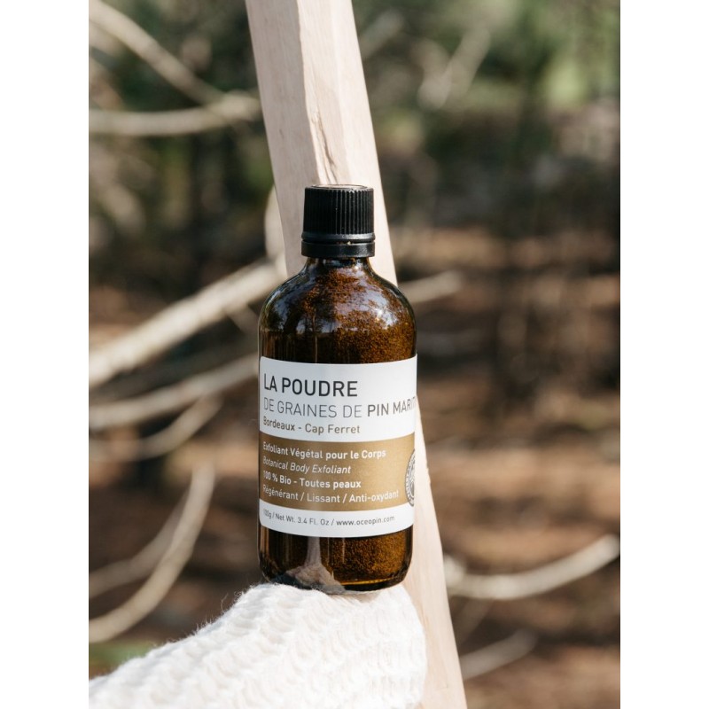 Exfoliant végétal au subtil parfum boisé et 100 % bio, la poudre de graines de pin maritime® adoucit et unifie l’épiderme, accélère son renouvellement et lui redonne souplesse et éclat. Utilisée en frictions douces, elle stimule la circulation, lisse et régénère la peau. Fine, elle n’agresse pas l’épiderme et convient à tous types de peaux, même sensibles.