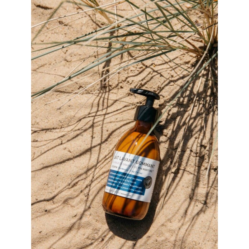 Les graines de pin maritime associées au sable fin exfolient en douceur, tandis que sa texture lait riche en huile de pin, macérat de mimosa et extrait de sauge nettoie et réhydrate l'épiderme.